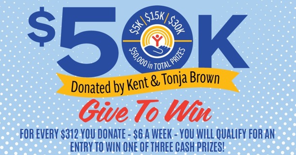 In 2025, those who donate at least $312, or $6 a week, will qualify for an entry into the Heartland United Way $50K Giveaway thanks to a generous gift from Campaign Chairs Kent and Tonja Brown.